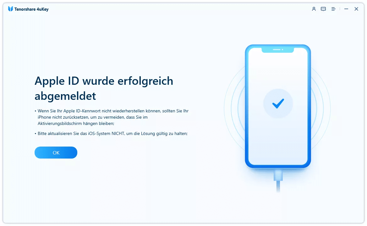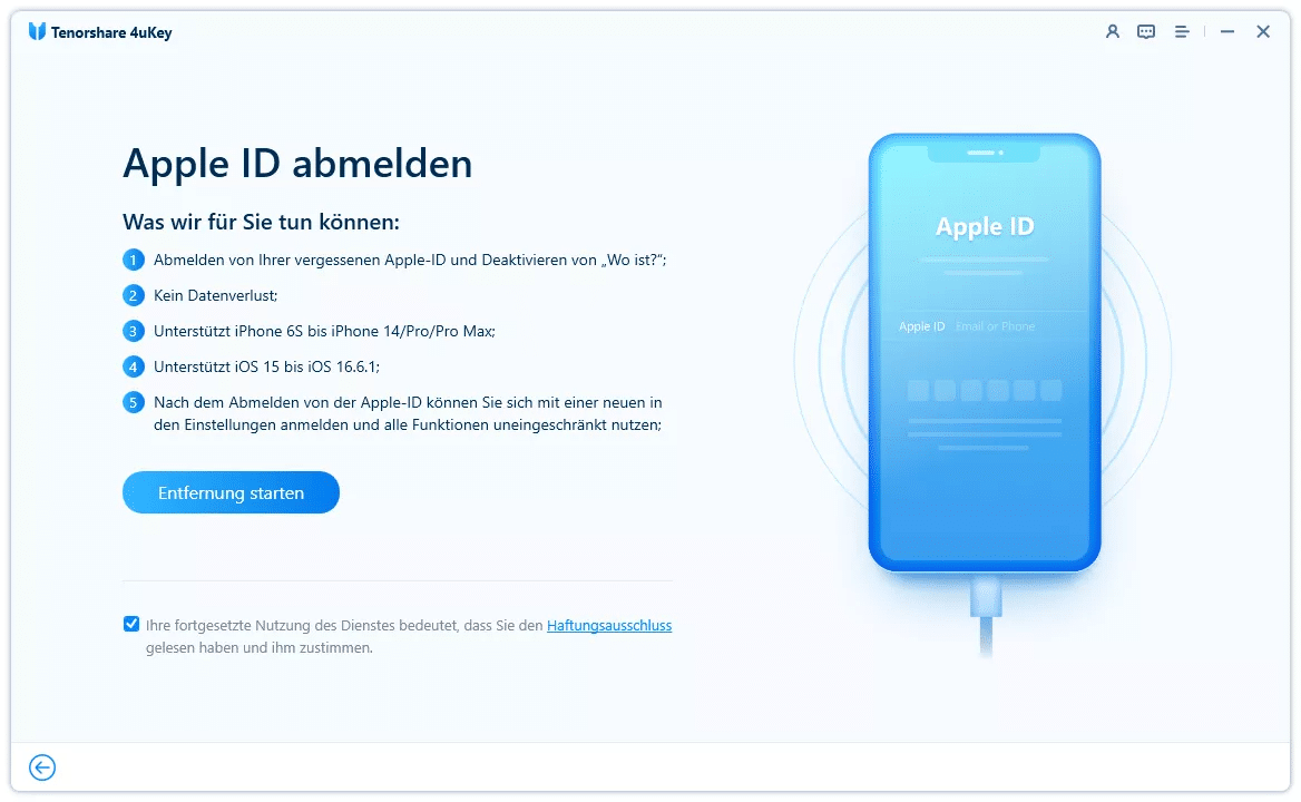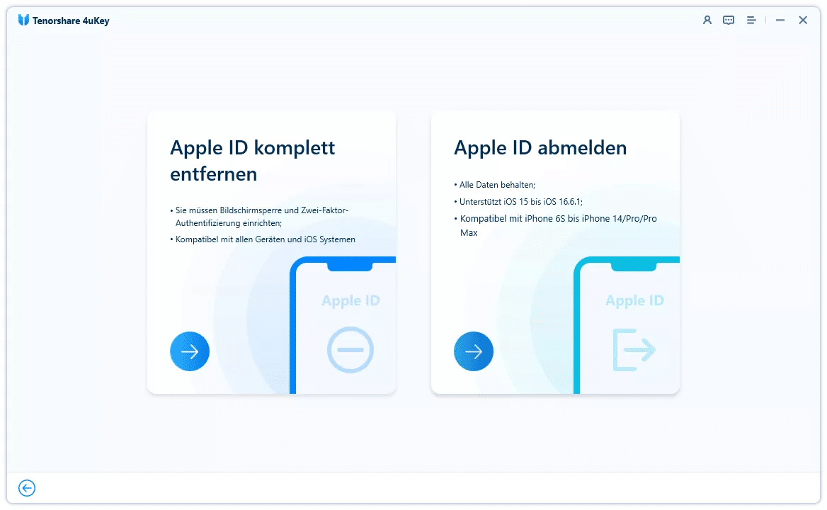 In solchen Fällen kann ein Tool wie Tenorshare 4uKey eine alternative Lösung bieten. Es ermöglicht, die Apple-ID direkt vom Gerät zu entfernen oder sich davon abzumelden – auch ohne Zugangsdaten.
