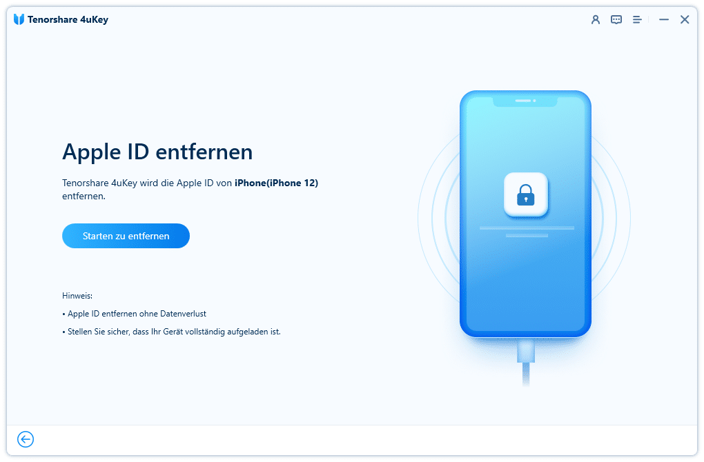 4. Klicken Sie auf „Weiter“ bzw. „Start“, um die Apple-ID zu entfernen. Folgen Sie den Anweisungen auf dem Bildschirm und trennen Sie das Gerät während des Vorgangs nicht.