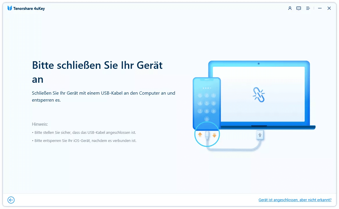 1. Starten Sie Tenorshare 4uKey auf Ihrem Computer und verbinden Sie Ihr iPhone oder iPad per USB-Kabel.